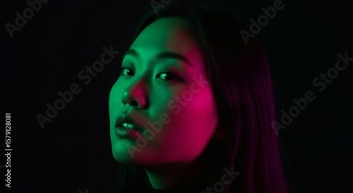 woman, female, girl, portrait, face, head, shoulder, hair, dark, long, asian, young, youth, beauty, beautiful, model, person, human, skin, light, lighting, green, pink, magenta, colours, colourful, vibrant, bright, studio, shot, background, black, looking, gaze, expression, emotion, mood, artistic, creative, style, fashion, glamour, elegance, modern, contemporary, sensual, seductive, alluring, attractive