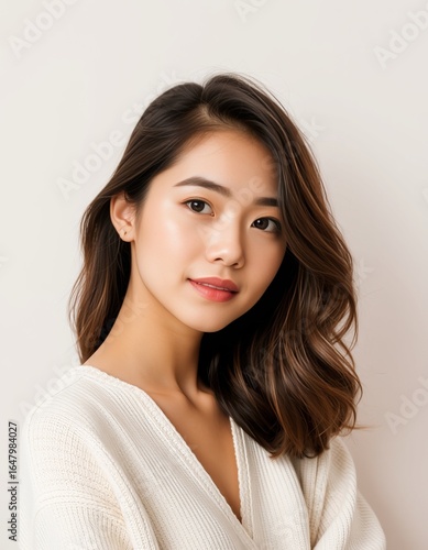 Portrait of a young asian woman with shoulder length wavy hair wearing a white sweater