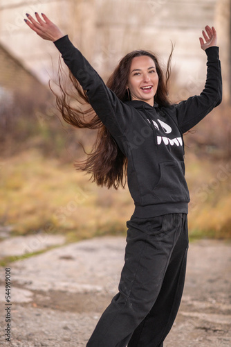 Portrait of a young beautiful cheerful dark-haired girl in a dark tracksuit.