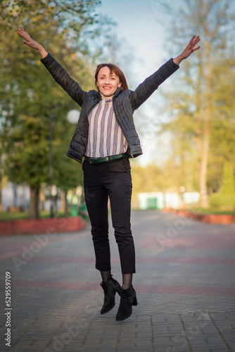 woman, business, businesswoman, people, person, success, smile, up, excited, arm, happiness, standing, winner, joy, beauty, suit, model, studio, jump, fashion, businessman, successful, hand, jumping, full