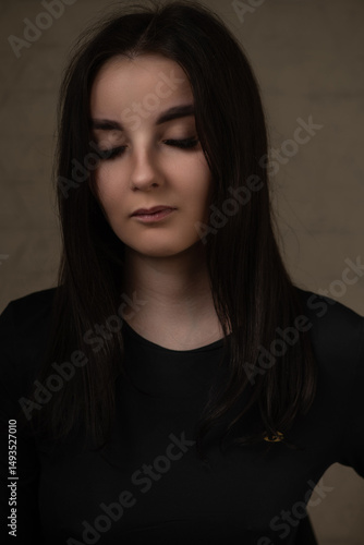Portrait of a young beautiful dark-haired girl in dark yoga clothes.