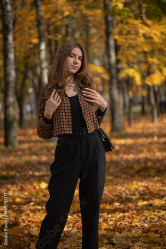 Portrait of a young beautiful long-haired girl in an autumn park.