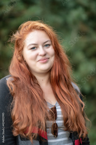 Portrait of a young beautiful red-haired plump girl in the forest.