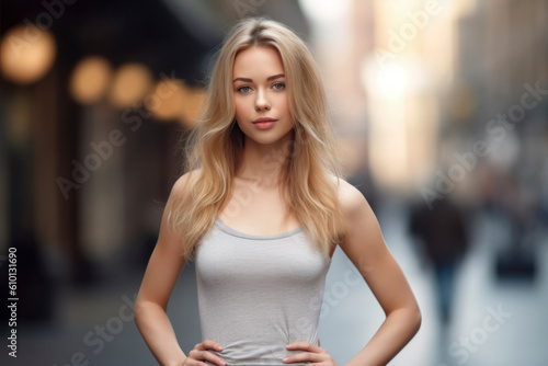 Portrait of a young beautiful smiling blonde woman outdoors. AI Generative