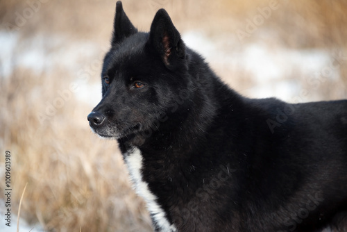 Portrait of a young black dog of the Russian-European Laika breed. The dog looks to the side. Hunting dogs.