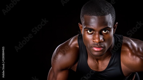 Portrait of a young Black man, intensely focused, against a dark background. His muscular physique and serious expression convey strength and determination.
