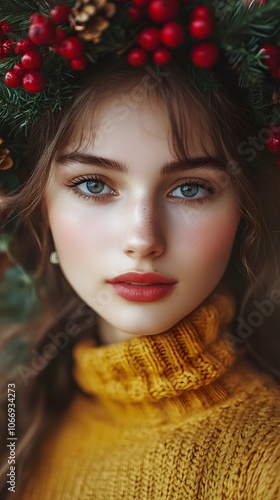 Portrait of a young Caucasian woman with a festive wreath, wearing a yellow sweater.