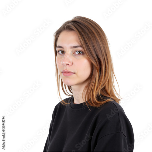 Portrait of a Young Caucasian Woman with Shoulder-Length Brown Hair in a Black Sweater Against a Plain transparent background