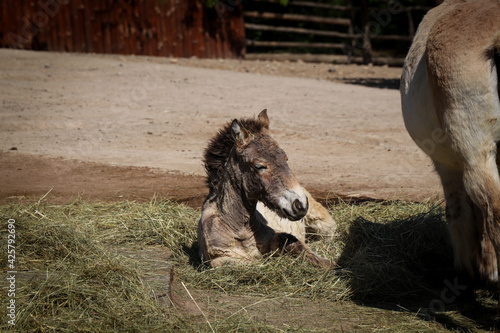 Portrait of a young Equus przewalskii resting in the shade on the grass. The last wild species of horse. Very wild animal. Teenager Przewalski's horse resting in the straw