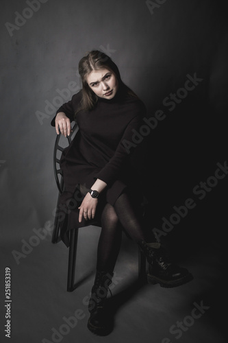 portrait of a young girl in a black dress on a gray background sitting in the studio