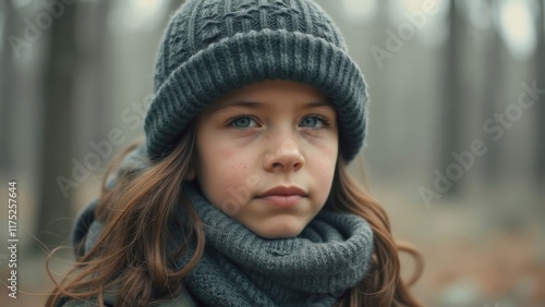 girl, portrait, blue eye, foulard, winter, forest, misty, young, cold weather, brunette, depth of field, nature, fall season, closeup, photo, serene, peaceful, childhood, natural beauty, artistic, timberland, fashion, candid, innocence, soft focus, contemplative, autumn, calm, stylish, scenic
