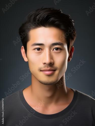 Portrait of a young japanese man, no facial expression, half body shot, facing the camera, photo, isolated black background, AI Generative