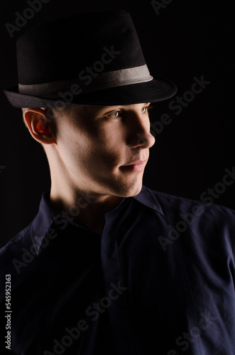 people, style, businessman, stylish, person, vintage, retro, photogenic, male, dark, adult, attractive, background, black, blue, face, hat, man, photo studio, portrait, shadow, shirt, young