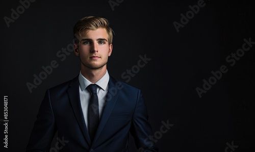 Portrait of a young man in a navy blue suit against a simple black backdrop