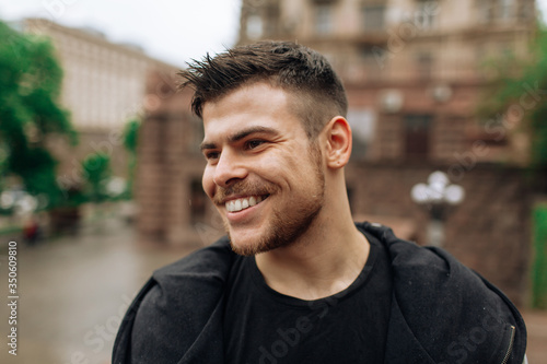 Portrait of a young man walking around the city. Brunette, beard. Cheerful, beautiful smile.
