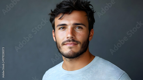 man, portrait, young, dark hair, beard, grey background, head shot, male, face, expression, casual attire, t-shirt, adult, guy, person, closeup, serious, calm, confident, masculine, stylish, modern, simple, clean, natural, real people, one person, studio shot, indoor, dark background, facial hair, brown eyes, short hair, coiffure, fashion, lifestyle, youth, attractive, photogenic, natural light, soft focus, hi-res, image, photo