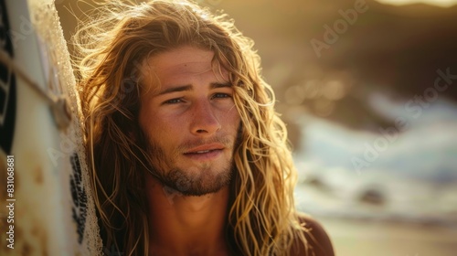 Portrait of a Young Man with Long Hair Embracing Surf Lifestyle on the Beach