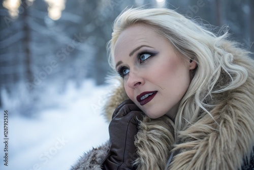 woman, winter, beauty, snow, cold, outdoors, face, nature, fashion, people, smiling, park, season, fur, hair, person, clothing, smile, model, tree, hat, coat, blond, forest