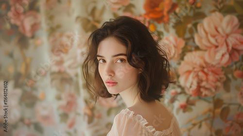woman, portrait, flower, pastel, floral, background, girl, beauty, model, fashion, pretty, young, face, hair, brown hair, eye, make-up, skin, shoulder, dress, elegant, romantic, delicate, soft, feminine, gentle, serene, calm, artistic, aesthetic, photo, studio, lighting, vintage, classic, aethereal