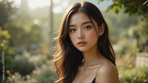 Portrait of a Young Woman in Natural Light Surrounded by Lush Greenery and Soft Sunlight
