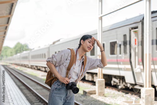 portrait of a young woman traveler with small backpack on the railway stantion waiting for the train to come