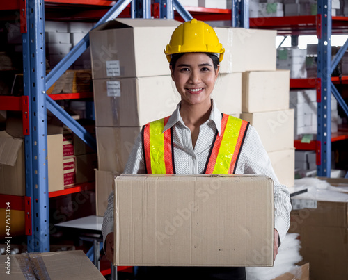 Portrait of a young woman warehouse worker is smiled happily while lifting the goods to arrange for delivery to the customers inside the warehouse. real people and real bodies concept