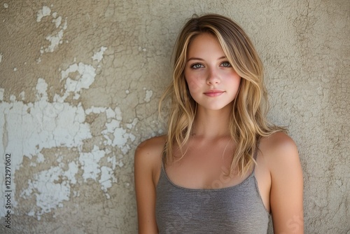 young, woman, curly, hair, portrait, confidence, rustic, wall, beauty, natural, light, serene, expression, casual attire, fashionable, relaxed, skin, tone, chic, elegant, posing, modern, youthful, art, individuality, wear, head shot, female, stylish, simplicity, emotion, posture, background, texture, depth, girl, fashion, attractiveness