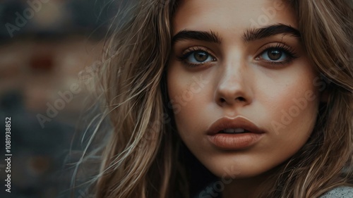 portrait, young, woman, expression, beauty, gaze, hair, lip, feature, emotion, background, late, afternoon, natural, light, detailed, captivating, striking, eye, stylish, model, fashion, effortless, serene, neutral, tone, skin, texture, coiffure, intimate, moody, urban, allure, youth, elegance, female, character, personality, contrast, aesthetic, visual, storytelling, human