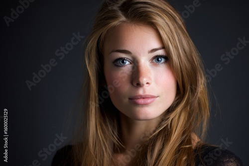 Portrait of a young woman with long red hair and blue eyes against dark background.