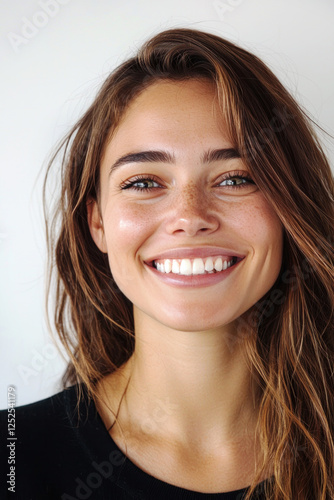 Portrait of a young woman with perfect skin, freckles and natural makeup on a white background.Beauty, cosmetics concept