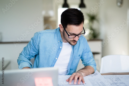 man, architect, adult, blueprint, job, male, occupation, office, paper, people, project, table, work, young, 20s, 30s, building, career, casual attire, caucasian, copy, desk, photogenic, happy, indoor, 1, person, plan, portrait, smiling, space, workplace