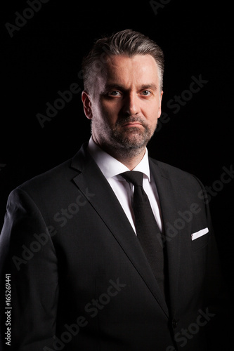 Portrait of adult confident businessman in studio photo on black background