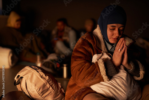 refugee, war, bomb, shelter, middle eastern, woman, pray, god, religion, hope, victim, civilian, attack, migrant, immigrant, refuge, asylum, settlement, camp, hiding, evacuation, dark, destruction, night, people, headscarf, muslim, ethnicity, gaza, arab, palestine, politic, conflict, crisis, problem, natural disaster, floor, distress, disaster, freedom, sorrowful, change, social issue, wants, safety, homeless, human rights, copy space