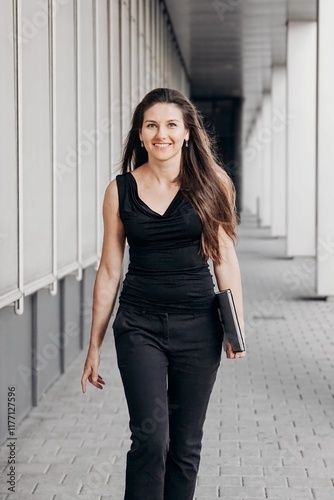 portrait of am attractive business woman, caring a laptop