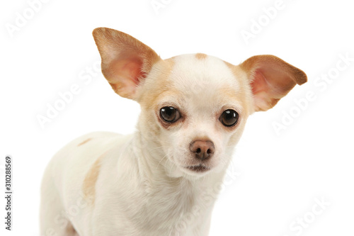 chihuahua, domestic, dog, pet, studio, adorable, alone, attention, beauty, bred, canino, curious, cute, mammal, vertebrate, eye, ear, mouth, nose, white background, isolated on white, portrait, head shot, fur, frontal, short-haired, small dog, standing, smart, serious, listening