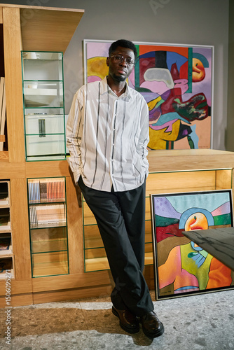 Portrait of an African American man standing in modern art gallery, surrounded by colorful contemporary artworks and wooden shelves. Man is leaning back against the counter