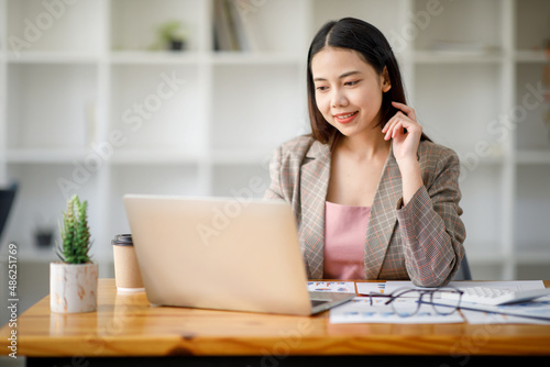 Portrait of an Asian young businesswoman working on a laptop computer in her workstation.Asian young Business people employee freelance online marketing Report e-commerce telemarketing concept.
