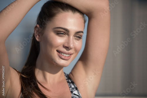 woman, fit, exercise, adult, authentic, portrait, lifestyle, physical exercise, female, beauty, athletic, attractive, fitness, healthy, training, happy, smile, active, people, jogger, sporty, runner, sun, strong, sunlight, summer, sunset, flare, sunburst, sport, confident, young, body, caucasian, joy, run, bright, gym, camera, copy, top, face, brightness, moisture, glare, evening, athlete, shoulder, focused