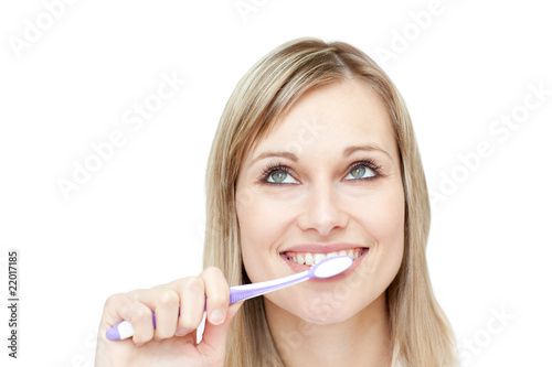 Portrait of an attractive woman brushing her teeth
