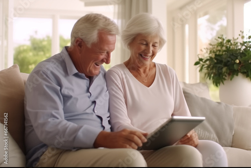 Portrait of an elderly couple of a happy Caucasian male and female, smiling and sitting at home on a couch with a tablet.