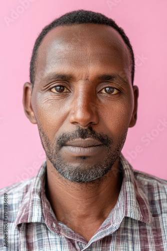 Portrait of an Ethiopian man on pink background for an ID or passport photo