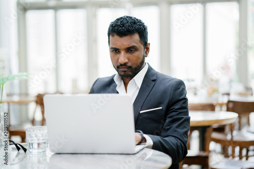 indian, businessman, lawyer, laptop, working, work, computer, suit, professional, photogenic, young, attract, short hair, earring, type, typing, head shot, head shot, profile, portrait, candid, relaxed, natural, authentic, cafes, to sit, sitting, office, campus, cafes, eatery, day, formal, investor, banker, celebrity, dark, tanned, serious, intense, fierce