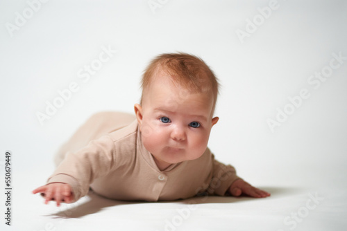 portrait of an infant learning to crawl against a white background