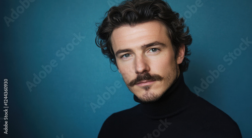 Portrait of an Irish actor showcasing wavy hair and a stylish black turtleneck against a vibrant blue background