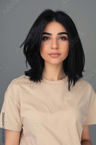 Portrait of arabic woman with black hair wearing a beige t-shirt