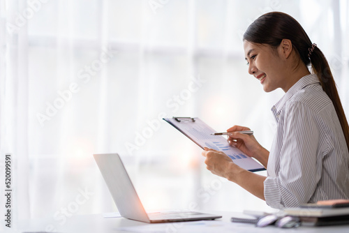 Portrait of Asian businesswoman with laptop Makes video calls and online meetings with colleagues at her office. Young woman working on a laptop in the office.