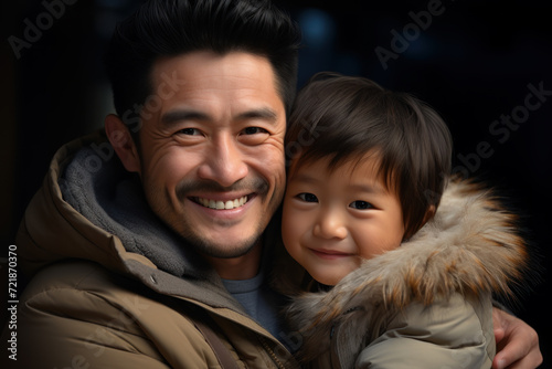 Portrait of Asian cute kid and Father hugging
