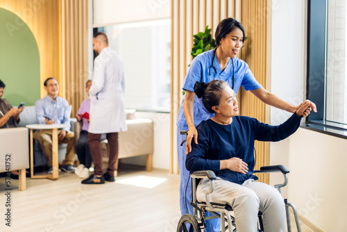 Portrait of asian woman physiotherapist trainer carer helping physical and discussing consulting talk with group asian senior patient by doing yoga workout exercises in rehabilitation at hospital