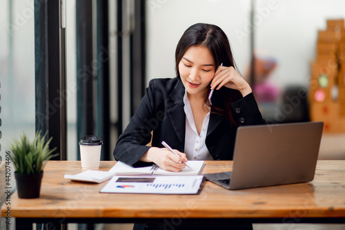 Portrait of Asian young female Businesswoman working on laptop computer doing finances,accounting analysis,report,data and pointing graph at the office.