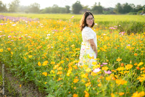 Portrait of asian Young woman happy traveler with white dress enjoying in Yellow and pink sulfur Cosmos flowers blooming field in the nature garden of in Chiang Mai,Thailand,travel relax vacation